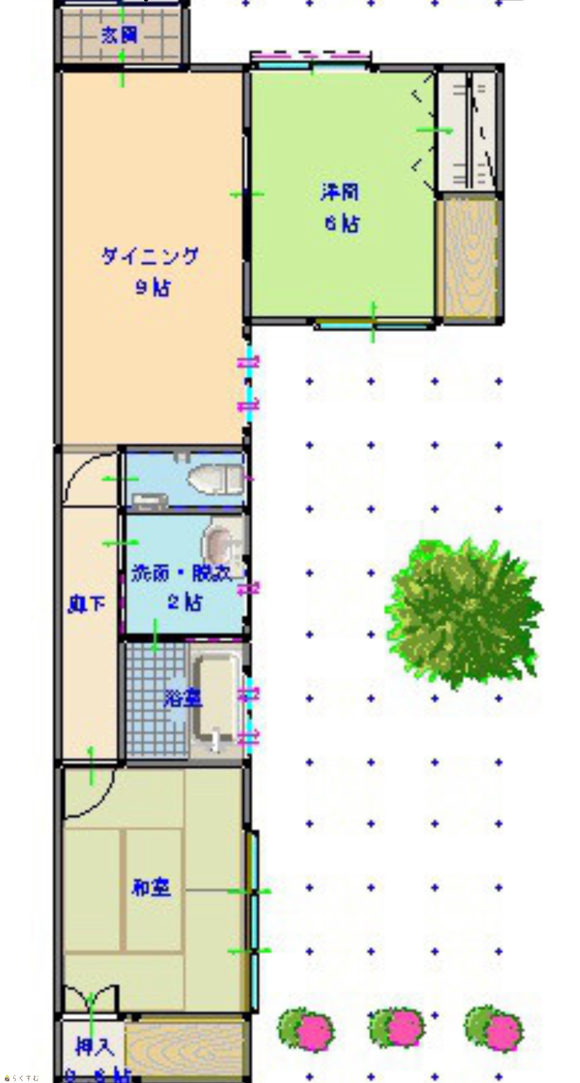 | 間取り | 2DK (和室:6畳) (洋室:6) DK9帖 専用庭あり |
