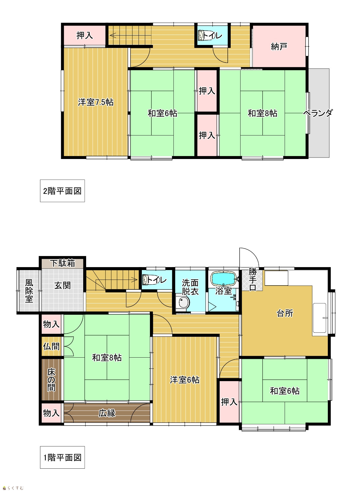 | 間取り | 6DK (和室:8畳、8畳、6畳、6畳) (洋室:7.5、6) DK8 2階納戸 |