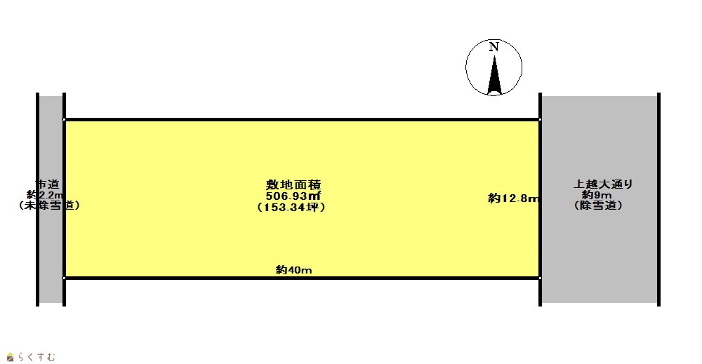 | 形状 | 間口 12.8m × 奥行 40m | 道路 | 東側約9m、西側約2.2m |