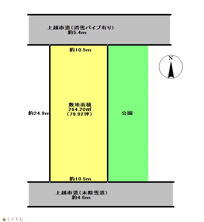 | 形状 | 間口 10.5m × 奥行 24.9m | 道路 | 北側約5.4m(消雪パイプ有り)、南側約4.6m(未除雪道) |