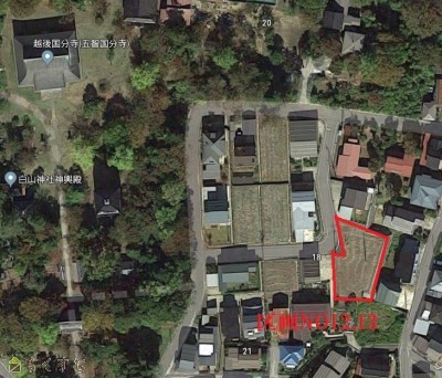 | 形状 | 間口 4.06m × 奥行 18.5m | 道路 | 上越市道:北側 6.5m |