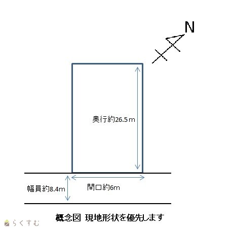 | 形状 | 間口 6m × 奥行 26.5m | 道路 | 北西側県道約8.4m 南東側市道 |