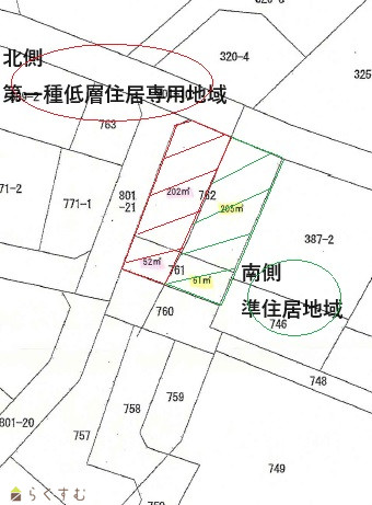 | 備考 | ・計2筆 ・建築条件なし ・※用途地域がまたがります。北側:第一種低層住居専用地域、南側:準住居地域(過半法による建築条件あり) ・本土地の東側:宅地内にガス、水道引込みあり。 ・本土地の西側:宅地内にガス、水道引き込みなし。 ・下水道受益金猶予中:買主にて306,800円の受益者負担金あり ・地目が現況「畑」農地転用許可申請(第5条)は売主負担にて行います。 ・本土地の東側に、NTTの電柱、支線が敷設されています。(所有権移転後に買主にて名義変更必要。また敷設料が入ります。) |