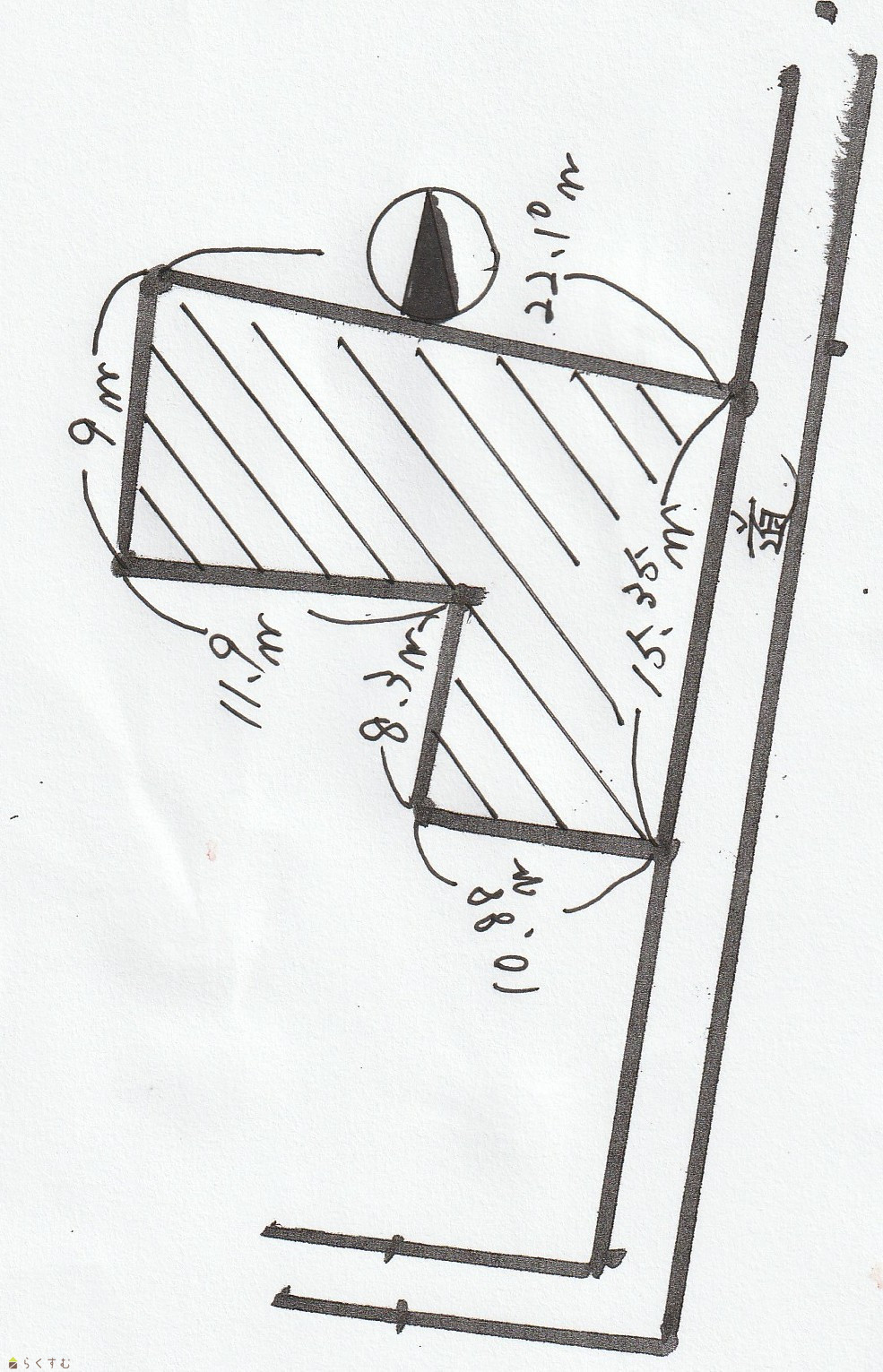 | 形状 | 間口 17m × 奥行 23m | 道路 | 東向き公道3m 無雪道路 道路内に消雪パイプあり |