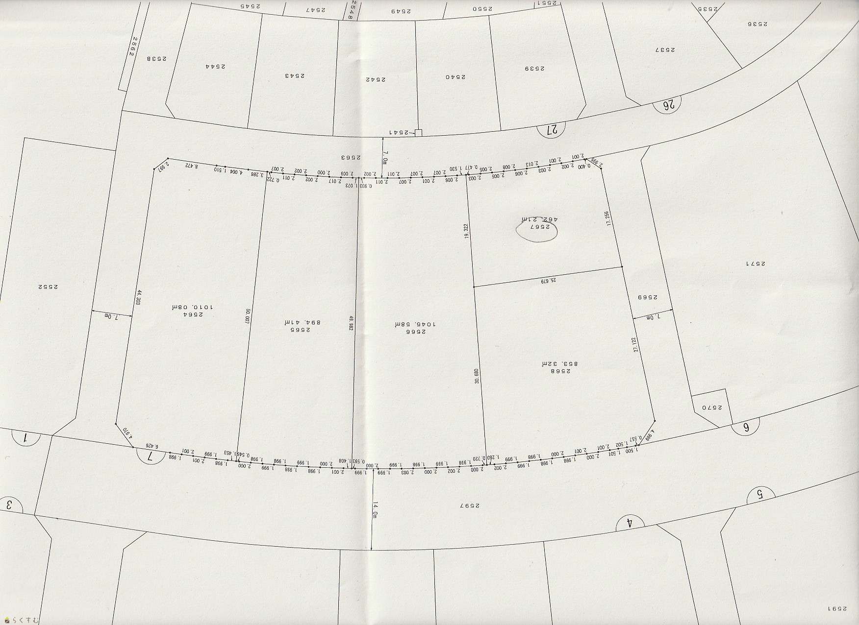 | 形状 | 間口 25.7m × 奥行 19m | 道路 | 南西7m、北西7m |