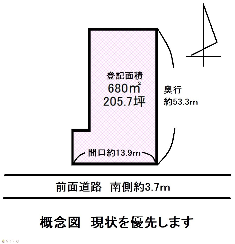| 形状 | 間口 13.9m × 奥行 53.3m | 道路 | 南側約3.7m |