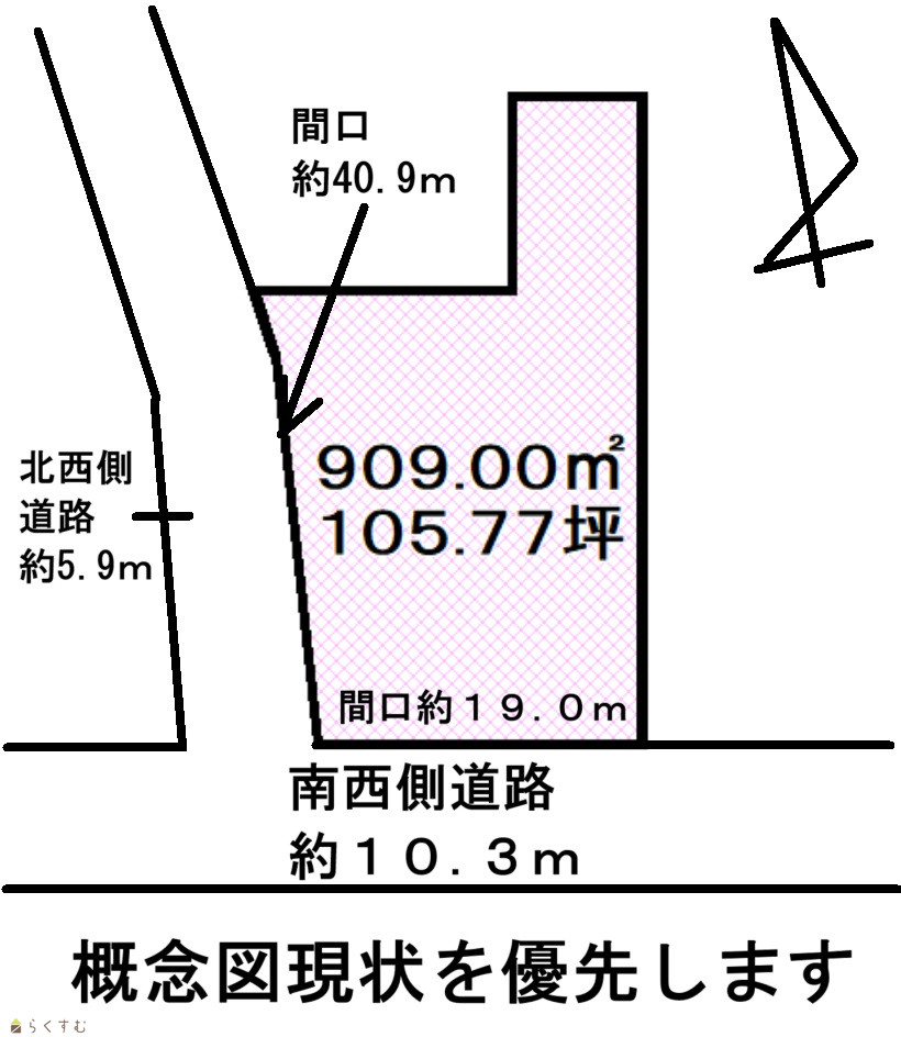 形状 | 間口 19.0m × 奥行 40.9m | 道路 | 南西側約10.3m、北西側約5.9m |