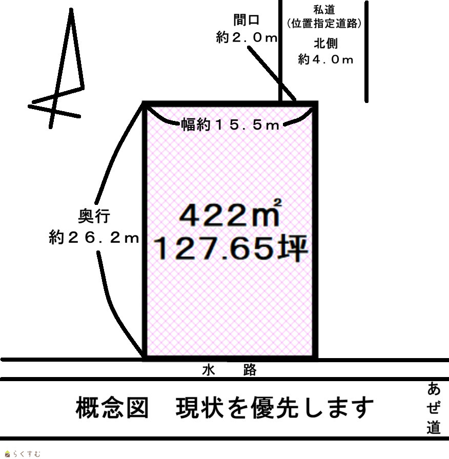 | 形状 | 間口 2.0m × 奥行 26.2m | 道路 | 北側約4.0m |