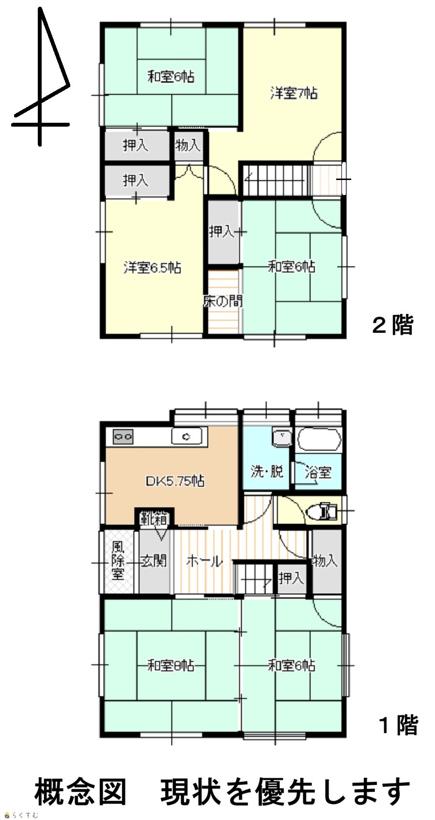 | 間取り | 6DK (和室:6畳、6畳、6畳、8畳) (洋室:6.5、7) DK5.75 |