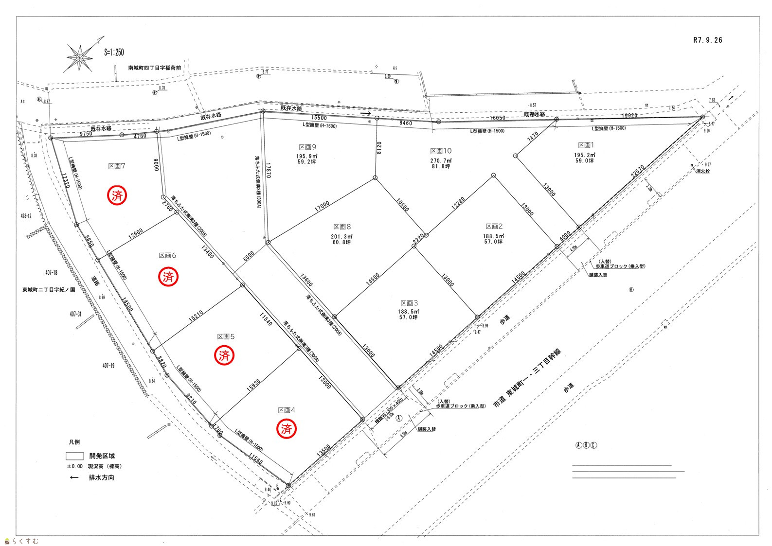 | 設備 | 前道6m以上、建築条件なし、所有権、側溝、電気、上水道(宅地内)、下水道(宅地内)、住宅向け | ||