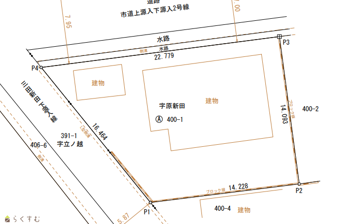 | 形状 | 間口 16.46m × 奥行 22.77m | 道路 | 市道 北側約7.2m 西側約5.7m |