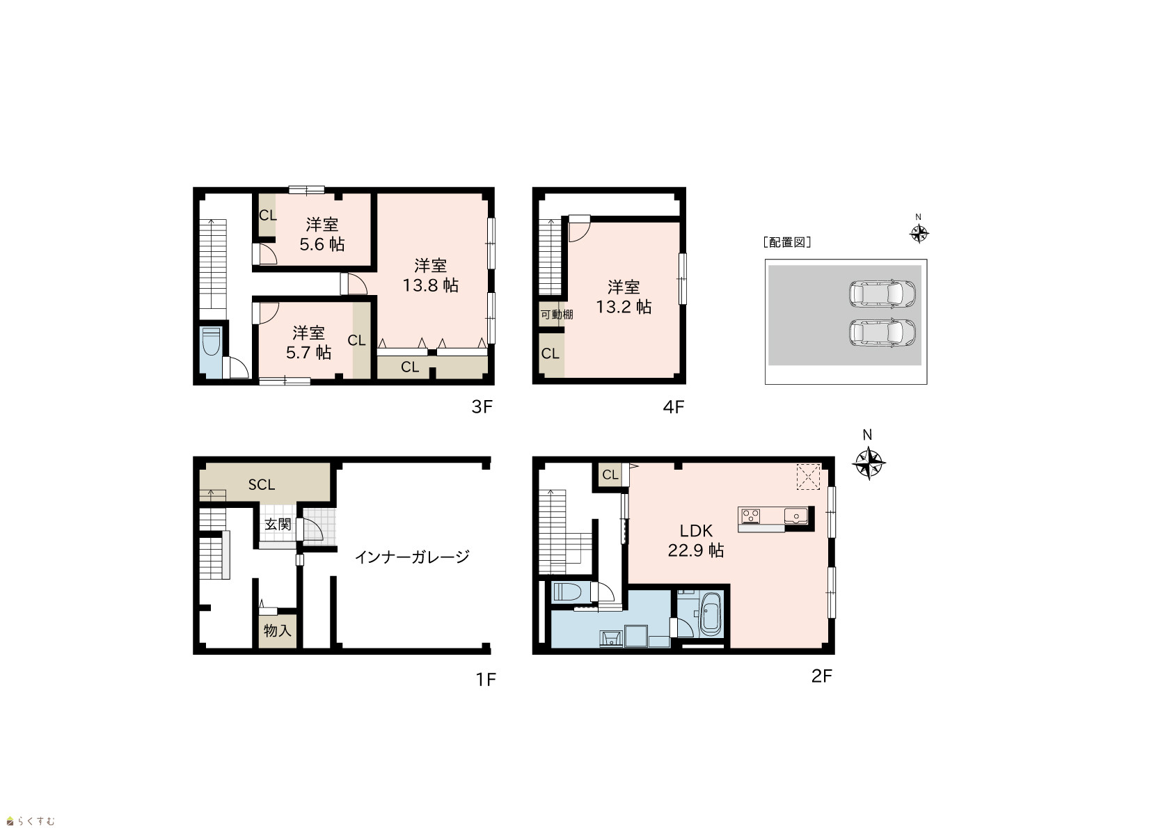 | 間取り | 4LDK (洋室:13.8、13.2、5.7、5.6) LDK22.9 |