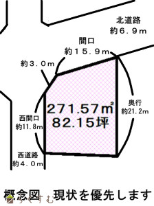 角地、整形地、前道6m以上、スーパー近く、閑静な住宅街、建築条件なし、所有権、側溝、電気、都市ガス(宅地内)、上水道(宅地内)、下水道(宅地内)、住宅向け